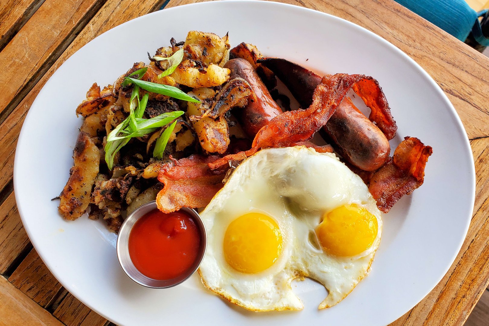 Double smoked bacon, two eggs, homestyle hash browns, served with toast, raspberry rhubarb jam and fresh fruits